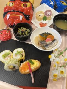 恵方巻き いなり軍艦 いわしの甘露煮 枝豆とひじきのごま和え 鬼除け汁 節分ロールケーキ